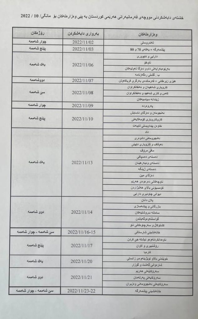 هەروەها دابهشكردنی مووچه تاكو 22-23ـی تشرینی دووهمی 2022 بهردهوام دهبێت.