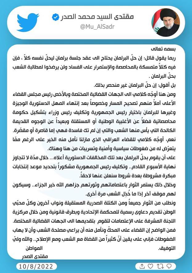 لە تویتێکدا موقتەدا سەدر، رێبەری رەوتی سەدر لەهەژماری فەرمی خۆی لە تۆڕی کۆمەڵایەتی تویتەر باسی لەوەکردووە کە پێویستە تا کۆتایی هەفتەی داهاتوو، دەسەڵاتی باڵای دادوەری کار بکات لەسەر هەڵوەشاندنەوەی ئەنجومەنی نوێنەران و سەرۆککۆماریش وادەی ئەنجامدانی هەڵبژاردنی پێشوەختە دیاری بکات و رابگەیەنێت.