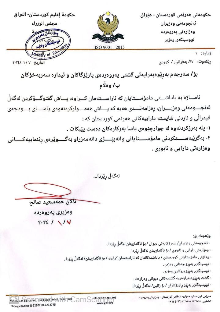 بەگوێرەی نووسراوێکی وەزارەتی پەروەردە کە واژۆی ئالان حەمە سەعید وەزیری پەروەردەی بەسەرەوەیە و ئاراستەی سەرجەم بەڕێوەبەرایەتیە گشتییەکانی پارێزگا و ئیدارە سەربەخۆکان کراوە، تێیدا هاتووە: “ئاماژە بە یاداشتی مامۆستایان کە ئاراستەمان کراوە، پاش گفتوگۆکردن لەگەڵ ئەنجومەنی وەزیران، رەزامەندی هەیە کە پاش هەموارکردنەوەی یاسای بودجەی فیدراڵی و ناردنی شایستە داراییەکانی هەرێمی کوردستان”.